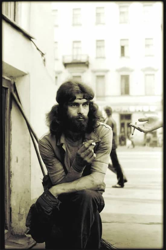 Boris Grebenschikov and a watch-woman, Moscow, 1987
